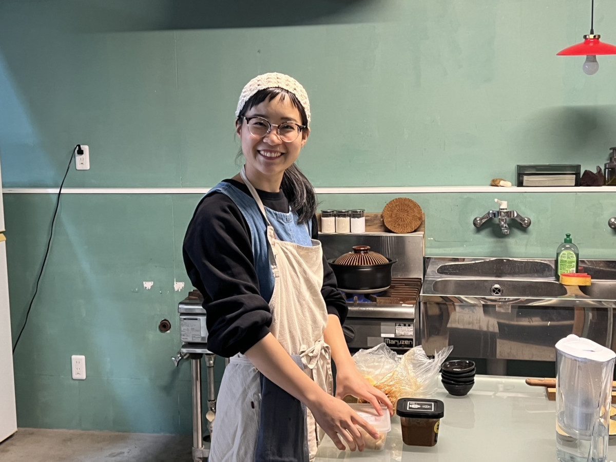料理をする店内の立石くるみさん=直方に土鍋ご飯とみそ汁の店「森の縁」