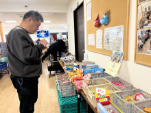 1カ月分の駄菓子を購入する施設のスタッフの方々=飯塚・東町商店街有志が「出張がんばる市」