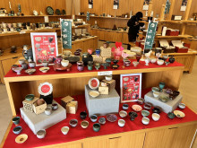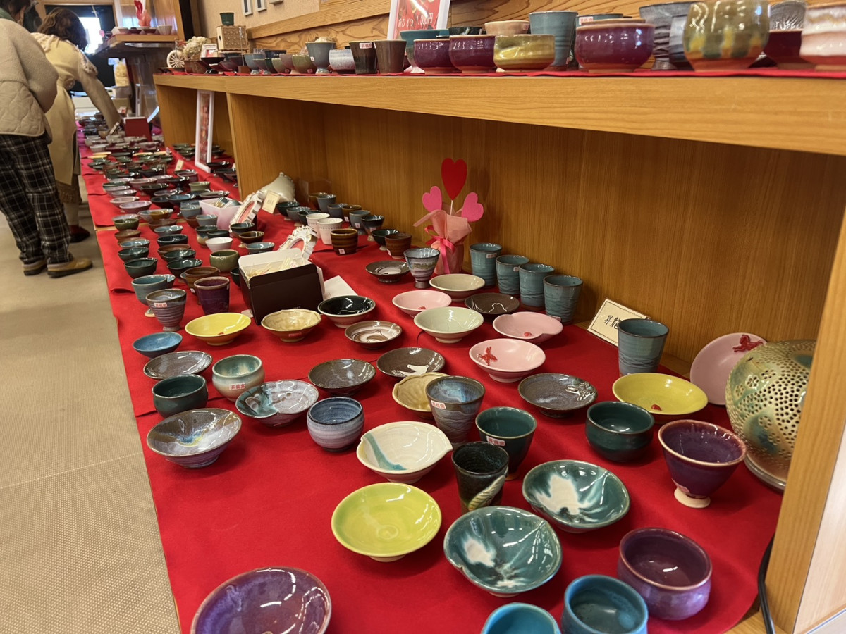 干支の「赤馬」やハート型など400点のおちょこが以上が並ぶ=福智・上野で「バレンタイン猪口展」
