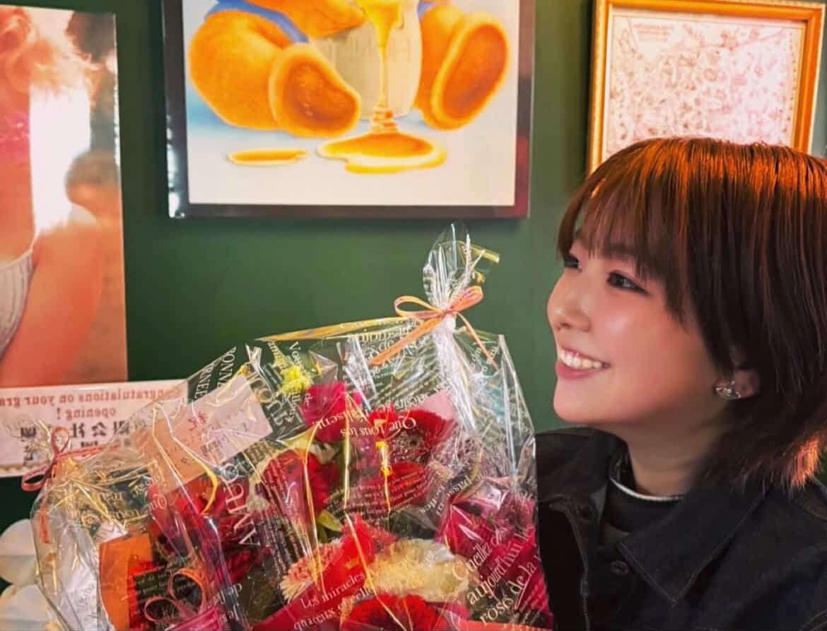 オープン祝の花と店主の梶原さん=嘉麻にカフェ「マイガール」(写真提供=MyGirl)