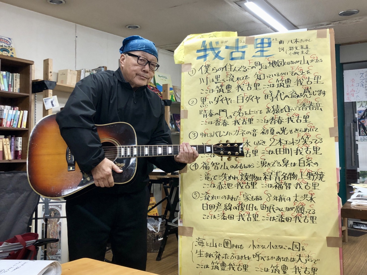 歌づくりのワークショップを行う講師の小柳圭史さん=田川・伊田商店街で大学生向け地域づくり(写真提供=LINKtagawa)
