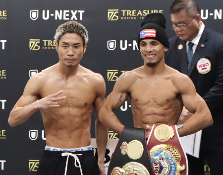 WBA、WBOライトフライ級タイトルマッチ(東京・後楽園ホール)の前日計量が2日、試合会場で行われ、挑戦者の谷口将隆(左)、2団体統一王者のレネ・サンティアゴがともにパスした。 【時事通信社】