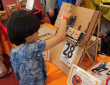 発明品(日めくりメクリッパー)に興味を持つ子ども=飯塚で発明イベント(写真提供=タカハ機工)