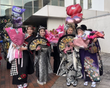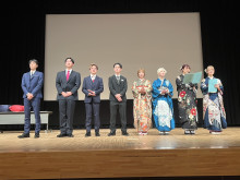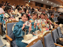 直方市の「ユメニティのおがた」(直方市山部)で1月11日、「二十歳のつどい」が開かれた。本年度で20歳を迎える対象者488人のうち、多くが振り袖や羽織はかま姿で出席し、友人らとの再会を喜び合った。
