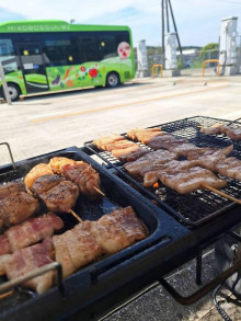 当日は、地元に根ざした飲食や雑貨など9店が出店。「松木精肉店」の豚串(ぶたくし)をはじめ、ハンバーガーやたこ焼き、焼き菓子、ハンドメード小物などの販売やワークショップ、警察車両の展示も行う。松ノ木さんは「バスの到着とともに新しい客が加わり、ホームや駅前がパッと華やぐ瞬間は駅前マルシェならではの醍醐味(だいごみ)。BRTを感じながら食べ歩きを楽しんでほしい」と呼びかける。