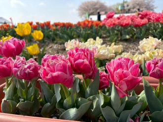 春の風物詩「のおがたチューリップフェア2026」が3月28日、遠賀川河川敷(直方市殿町)で始まった。