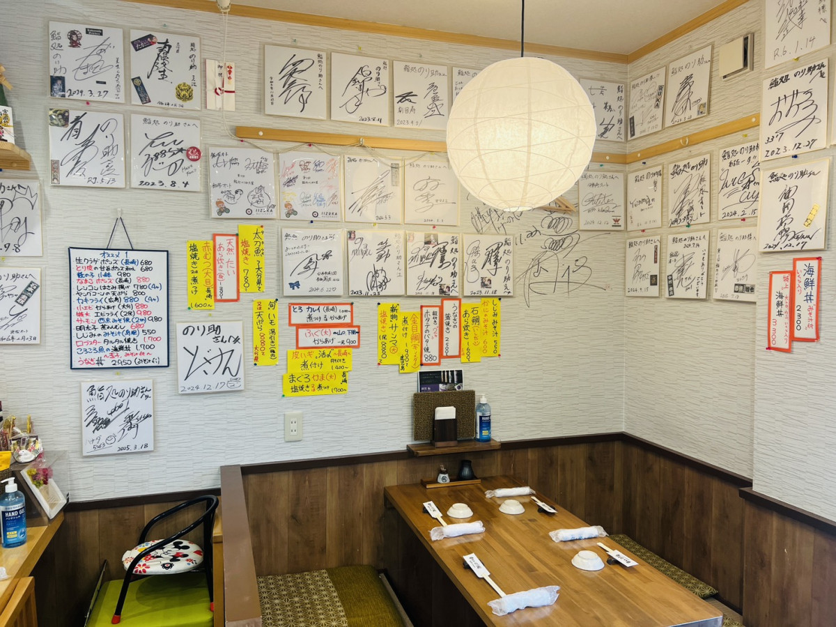 店内には著名人のサインが並ぶ=桂川町のすし店「鮨処 のり助」が3周年