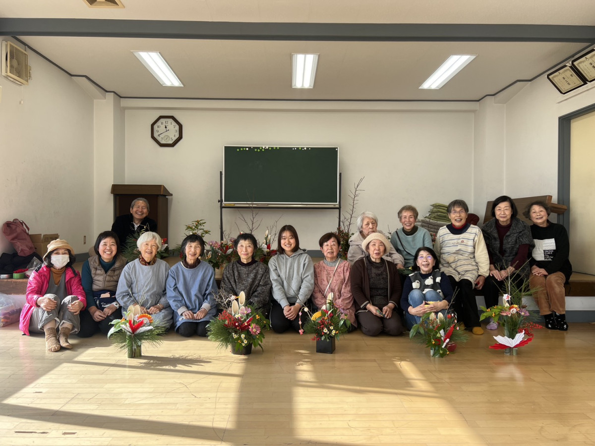 福智町草場地区の公民館(福智町市場)で12月22日、恒例の「正月飾り作り」が行われ、住民ら17人が参加した。