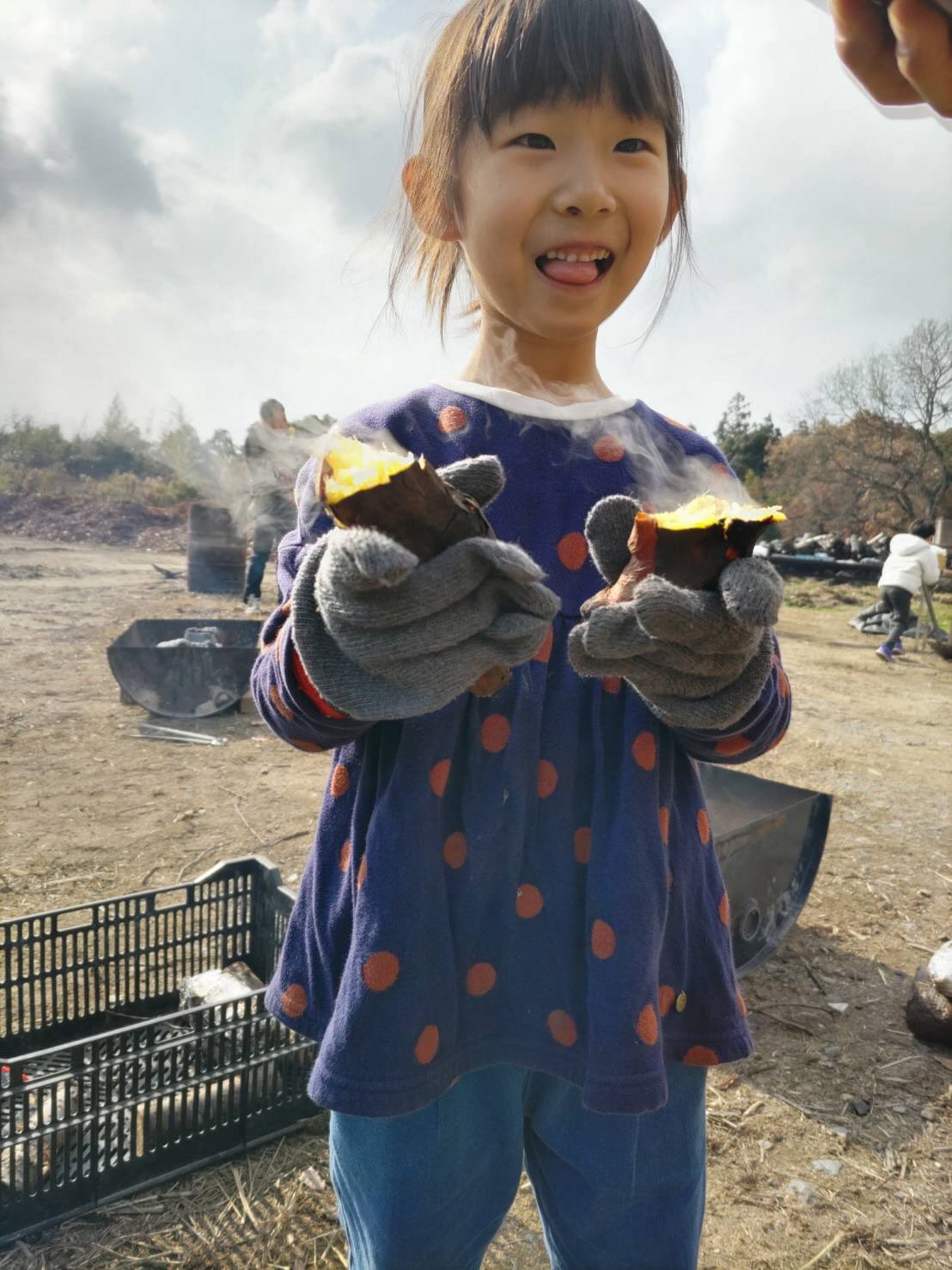 たき火で作った焼き芋を持つ参加者=直方・福智山ろく花公園で「焼き芋&たき火教室」(写真提供=福智山ろく花公園)