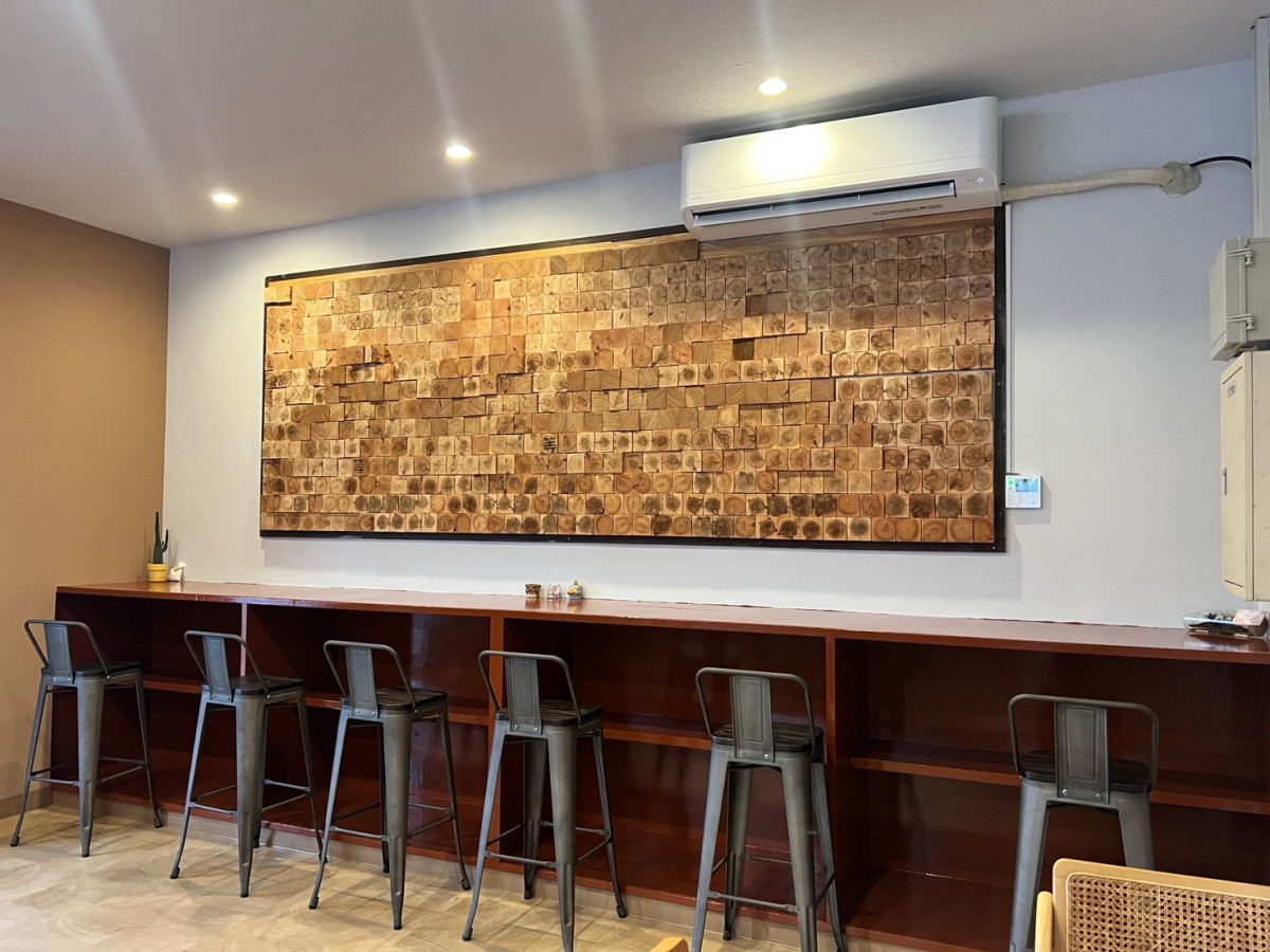 香春岳をイメージした木材の壁面アート=香春・旧中津原小学校跡にカフェ「珈琲香舎」