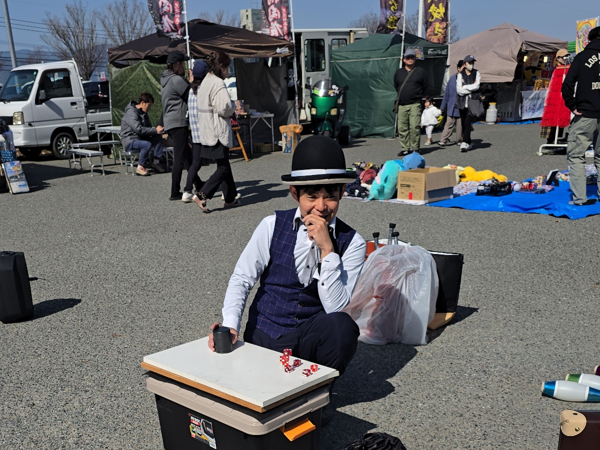 パフォーマーE.M.Fさんのパフォーマンスの様子=飯塚でカーブーツ(写真提供=筑豊イベントサプライ)