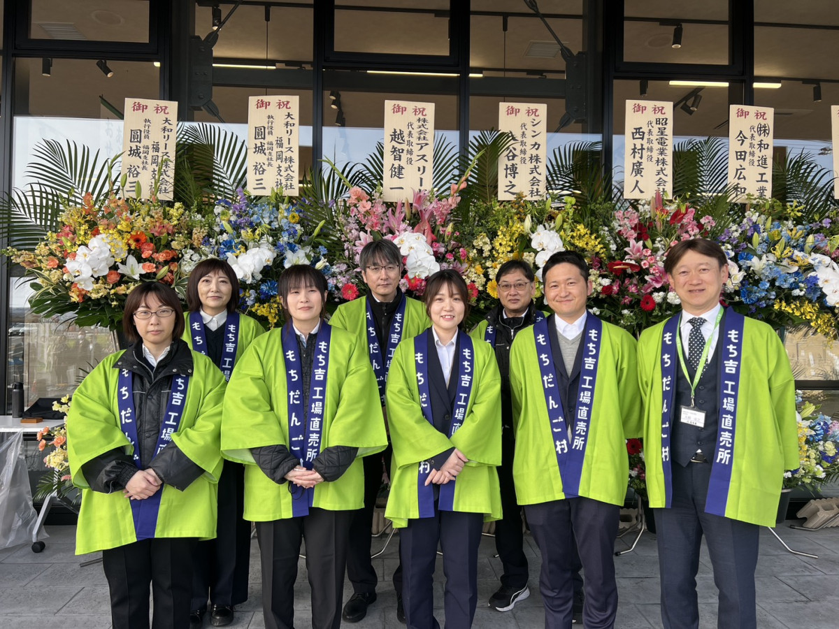 直方の「もちだんご村」(直方市下境)に3月5日、米菓メーカー「もち吉」(同)の新施設「もち吉工場直売所」がオープンした。