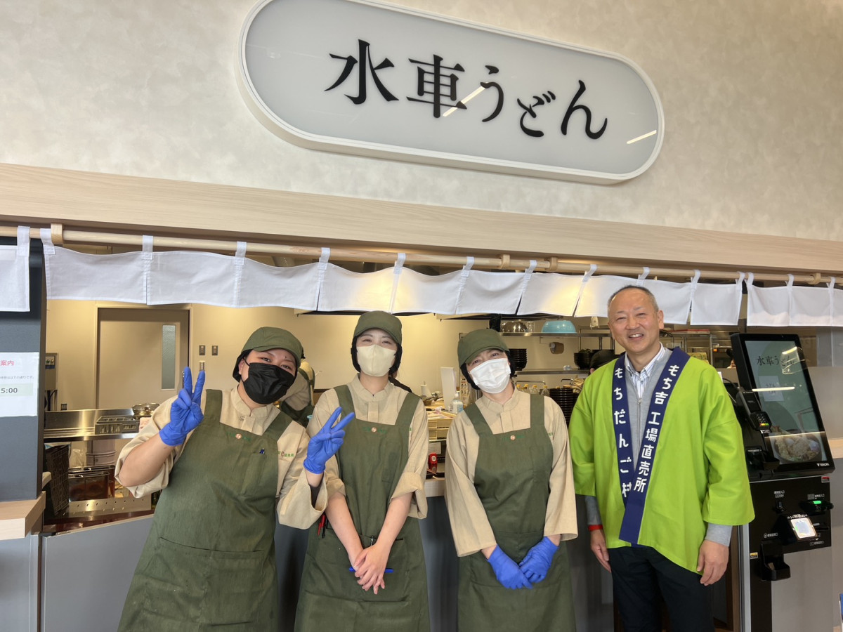 もちもち麺のうどんを提供する「水車うどん」のスタッフ=直方に「もち吉工場直売所」開店