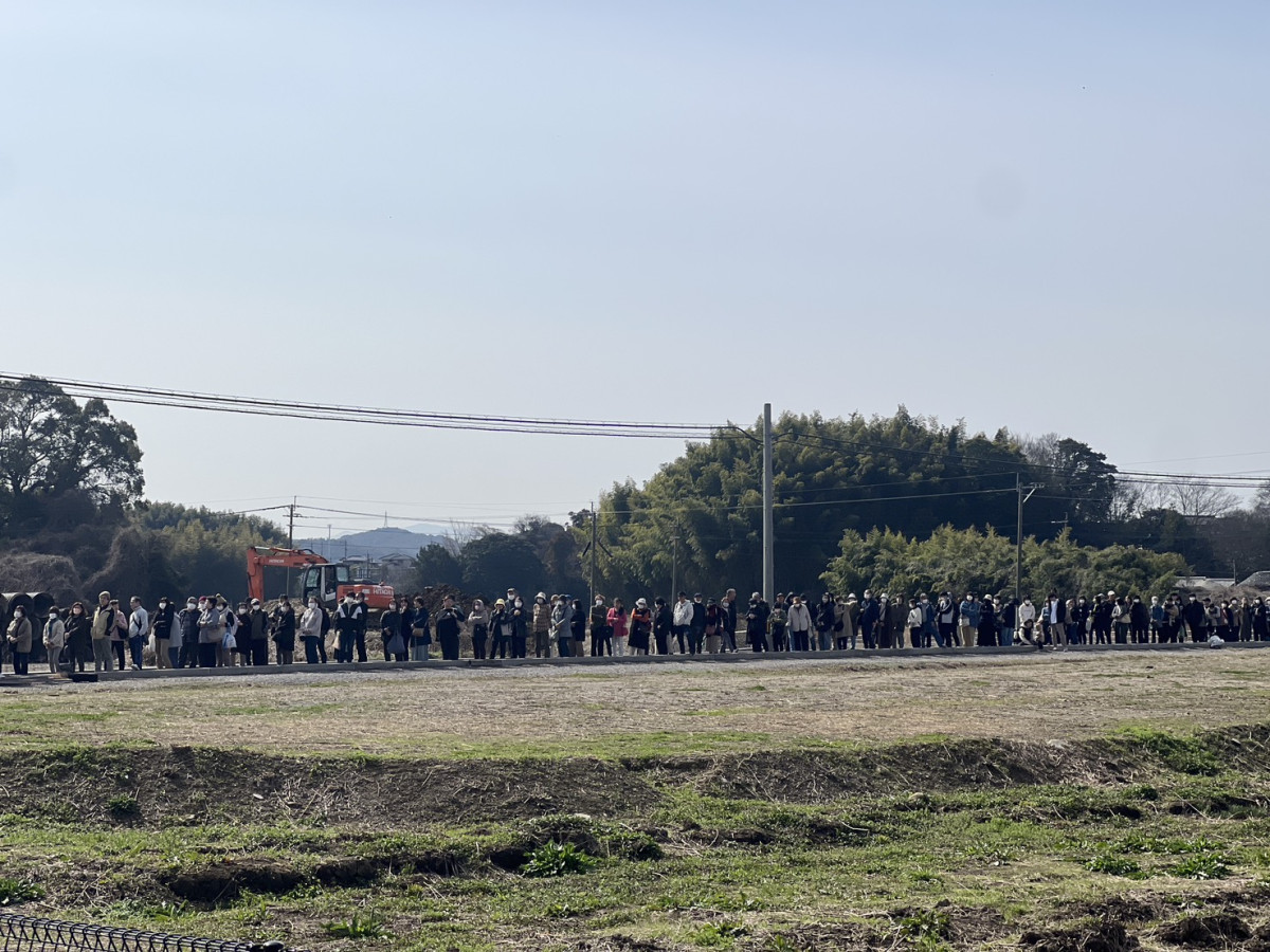 田んぼ道まで続く長い行列=直方に「もち吉工場直売所」開店