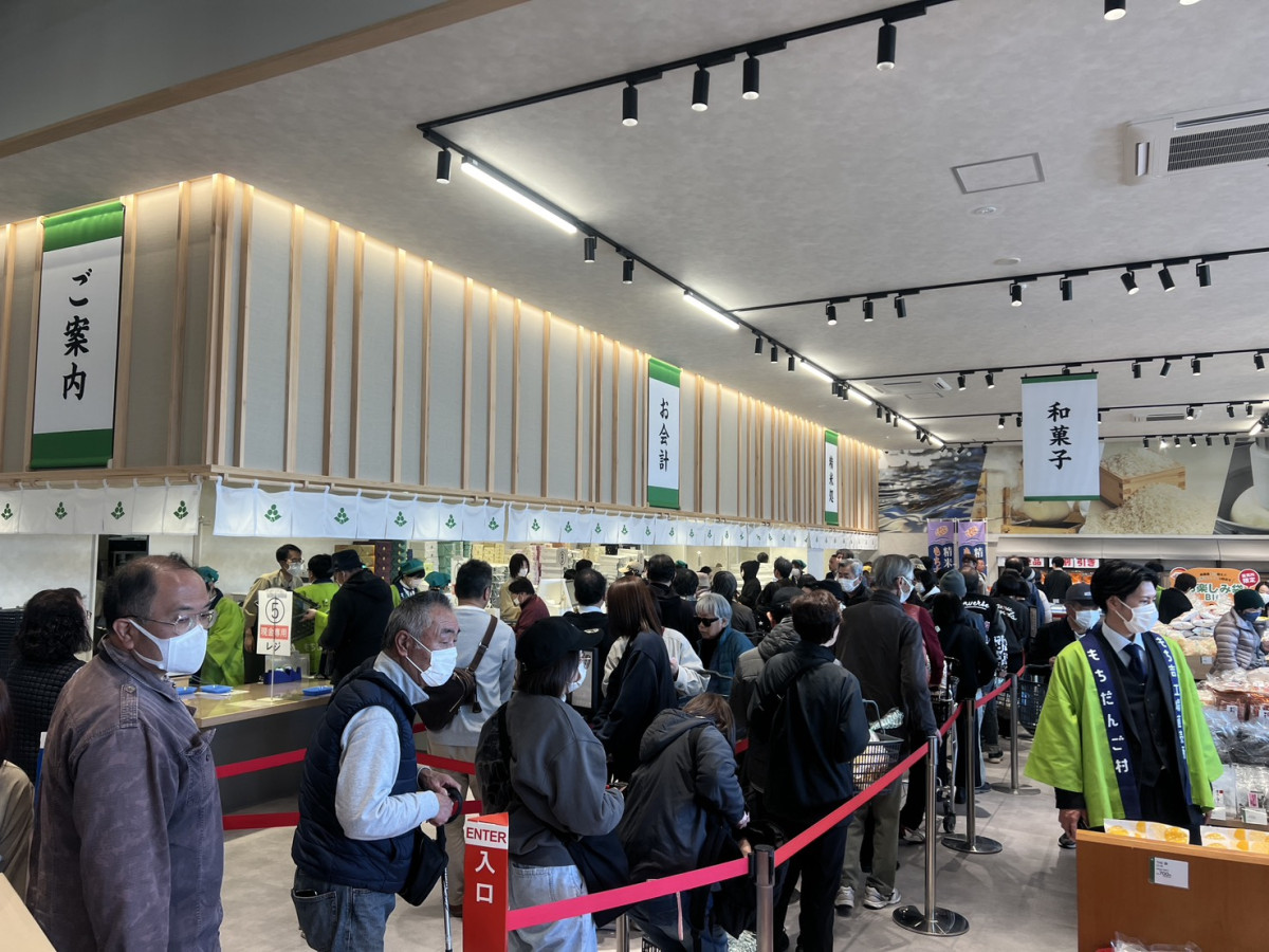 直方の「もちだんご村」(直方市下境)に3月5日、米菓メーカー「もち吉」(同)の新施設「もち吉工場直売所」がオープンした。