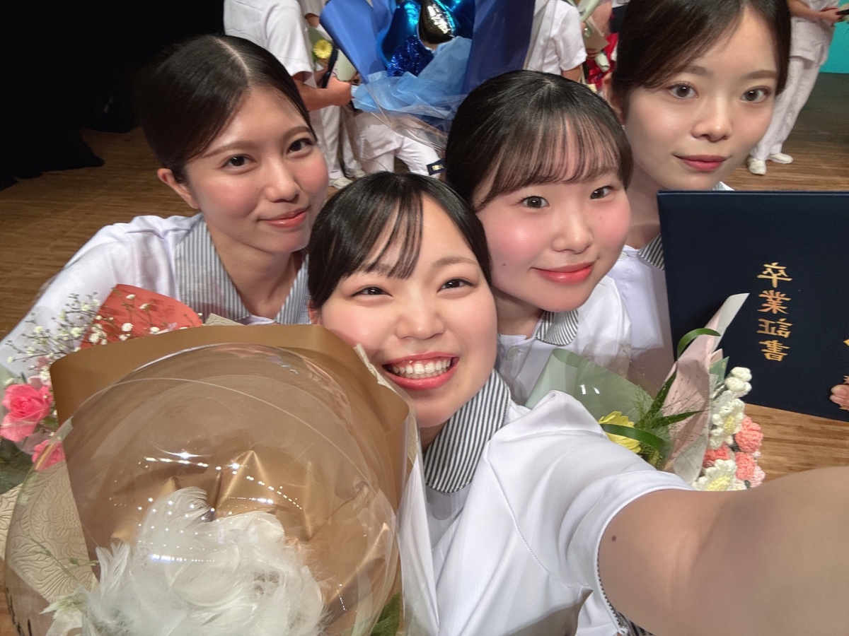 卒業を喜ぶ「麻生看護大学校」の卒業生=飯塚・麻生看護校で卒業式(写真提供=麻生看護大学校)